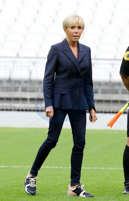 Brigitte Macron w czarnym garniturze i butach sportowych na Stade de France