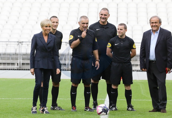 Brigitte Macron w czarnym garniturze i butach sportowych na Stade de France