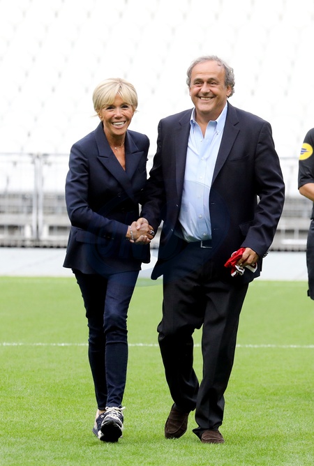 Brigitte Macron w czarnym garniturze i butach sportowych na Stade de France