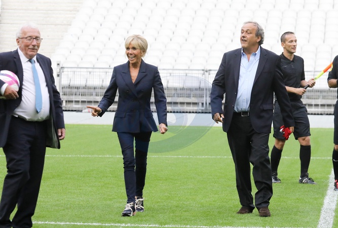 Brigitte Macron w czarnym garniturze i butach sportowych na Stade de France