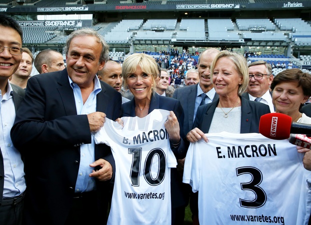 Brigitte Macron w czarnym garniturze i butach sportowych na Stade de France