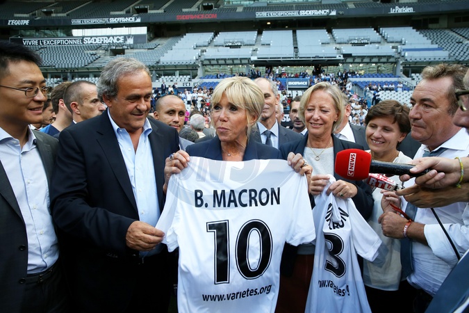 Brigitte Macron w czarnym garniturze i butach sportowych na Stade de France