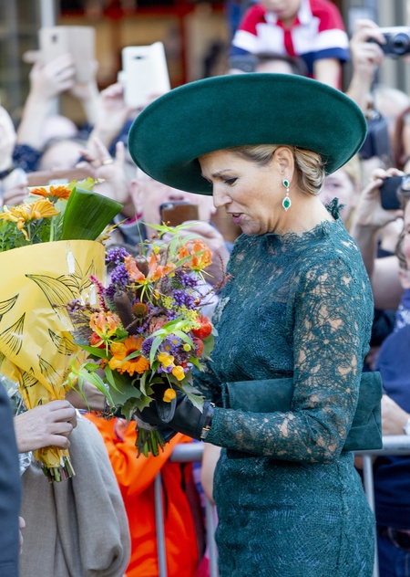 Krolowa Maxima w koronkowej, zielonej sukience i kapeluszu