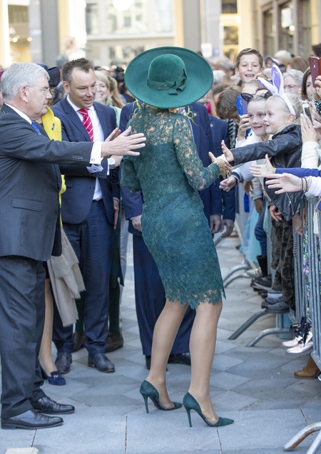 Krolowa Maxima w koronkowej, zielonej sukience i kapeluszu