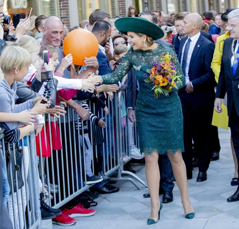 Krolowa Maxima w koronkowej, zielonej sukience i kapeluszu