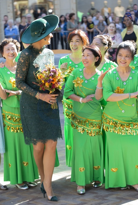 Krolowa Maxima w koronkowej, zielonej sukience i kapeluszu