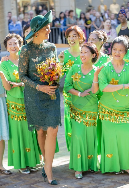 Krolowa Maxima w koronkowej, zielonej sukience i kapeluszu