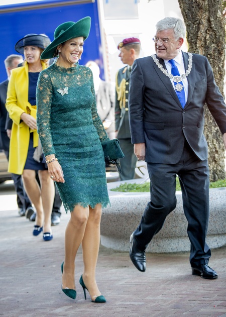 Krolowa Maxima w koronkowej, zielonej sukience i kapeluszu