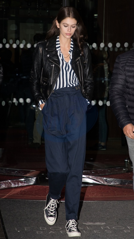 Kaia Gerber w koszuli w paski i w skorzanej kurtce