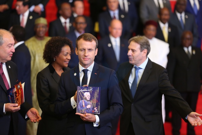 Emmanuel Macron prezentuje znaczki z Charlesem Aznavourem