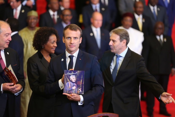 Emmanuel Macron prezentuje znaczki z Charlesem Aznavourem