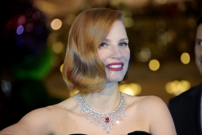 Jessica Chastein na choinkowej inauguracji w Galeries Lafayette