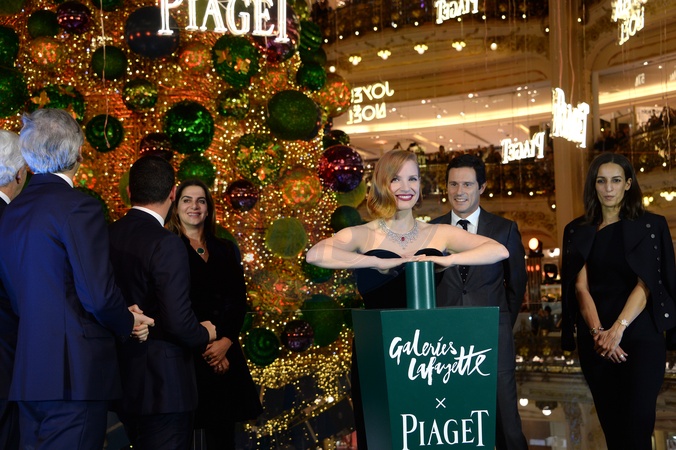 Jessica Chastein na choinkowej inauguracji w Galeries Lafayette