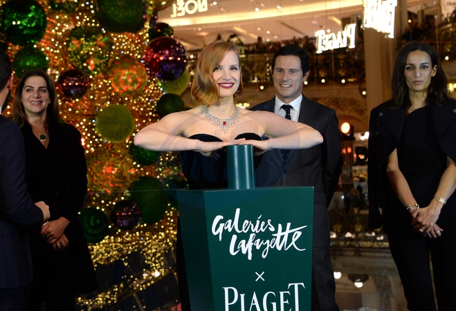 Jessica Chastein na choinkowej inauguracji w Galeries Lafayette