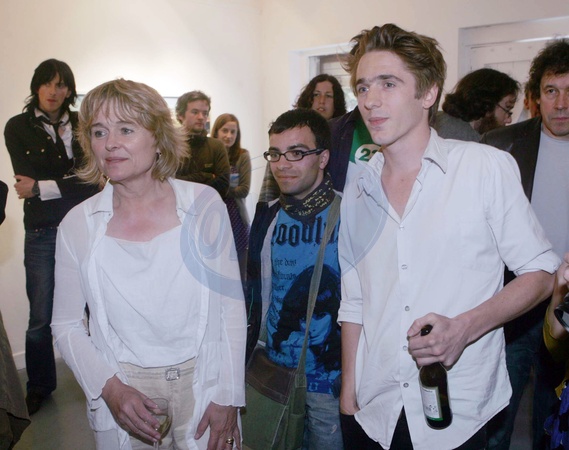 Samuel Irons z matka Sinead Cusack, ojcem Jeremym i dziewczyna Kasia na otwarciu wystawy swoich zdjec z Izraela i Palestyny w The Monster Truck Gallery, Dublin, Irlandia