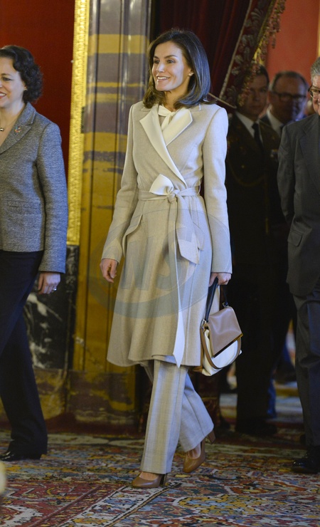 Krolowa Letizia w bezowym plaszczu w National Employment Institute w Madrycie