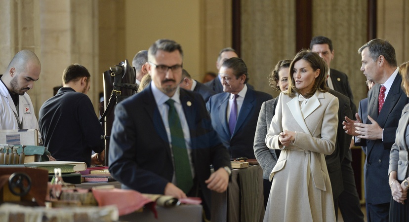 Krolowa Letizia w bezowym plaszczu w National Employment Institute w Madrycie