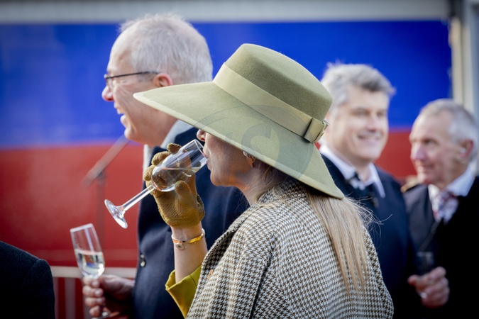 Krolowa Maxima w plaszczu w pepitke i w duzym kapeluszu