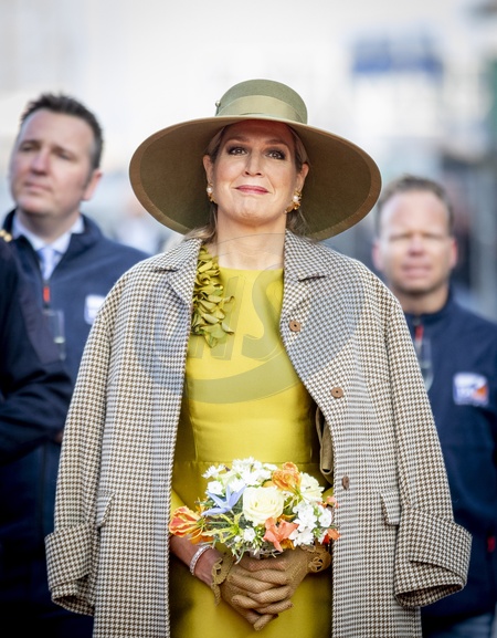 Krolowa Maxima w plaszczu w pepitke i w duzym kapeluszu