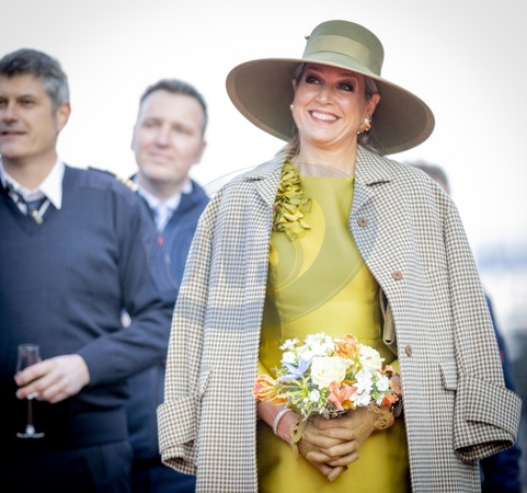 Krolowa Maxima w plaszczu w pepitke i w duzym kapeluszu