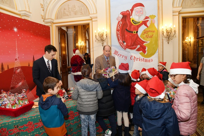 Ksiaze Albert i Louis Ducruet z dziecmi na spotkaniu swiatecznym