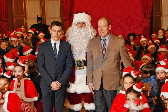 Ksiaze Albert i Louis Ducruet z dziecmi na spotkaniu swiatecznym