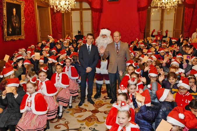 Ksiaze Albert i Louis Ducruet z dziecmi na spotkaniu swiatecznym