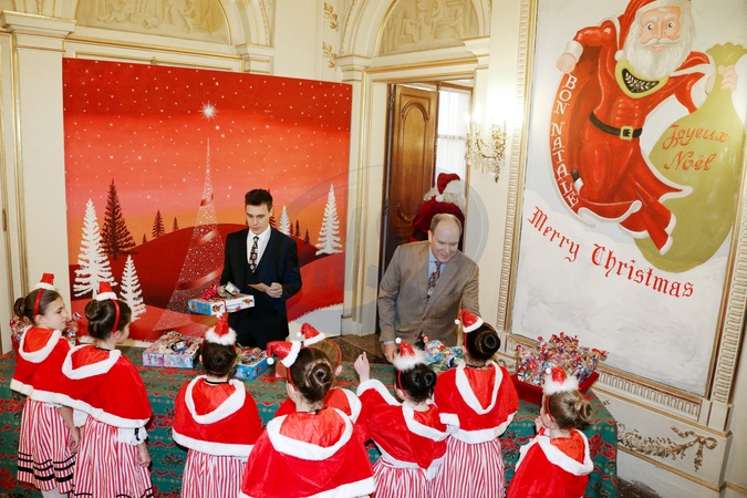 Ksiaze Albert i Louis Ducruet z dziecmi na spotkaniu swiatecznym
