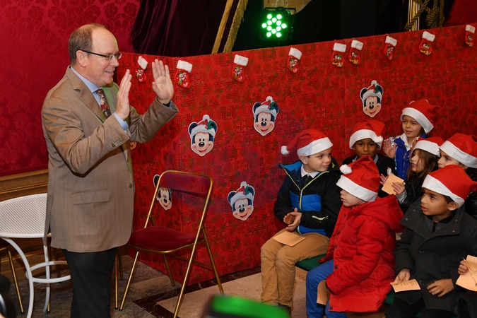 Ksiaze Albert i Louis Ducruet z dziecmi na spotkaniu swiatecznym