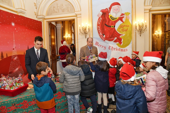 Ksiaze Albert i Louis Ducruet z dziecmi na spotkaniu swiatecznym