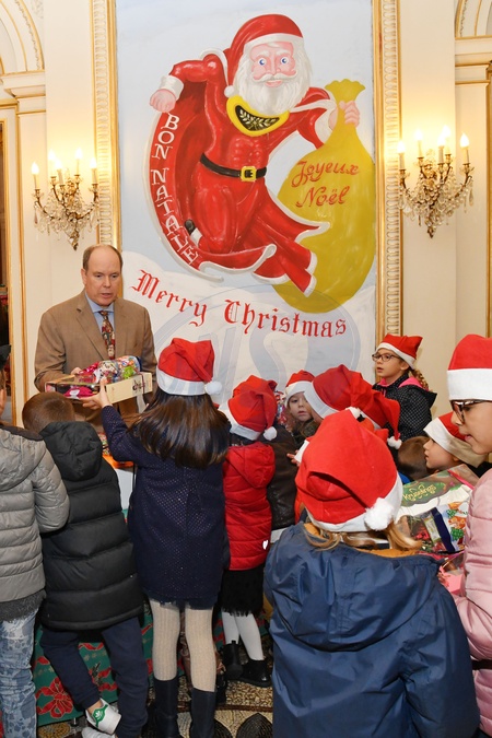 Ksiaze Albert i Louis Ducruet z dziecmi na spotkaniu swiatecznym