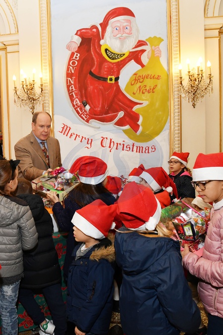 Ksiaze Albert i Louis Ducruet z dziecmi na spotkaniu swiatecznym