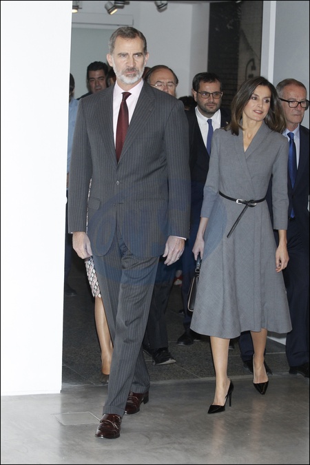 Krolowa Letizia w szarej, kopertowej sukience na wystawie (Poetics of Democracy. Images of the Transition)