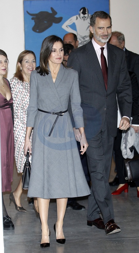Krolowa Letizia w szarej, kopertowej sukience na wystawie (Poetics of Democracy. Images of the Transition)
