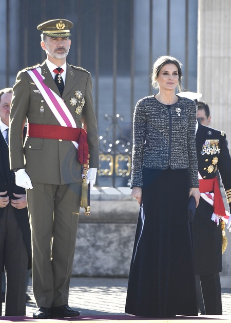 Krolowa Letizia i krol Filip podczas tradycyjnej parady wojskowej
