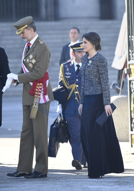 Krolowa Letizia i krol Filip podczas tradycyjnej parady wojskowej