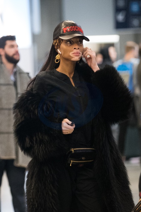 Winnie Harlow w czarnym futrze, maluje sie na lotnisku