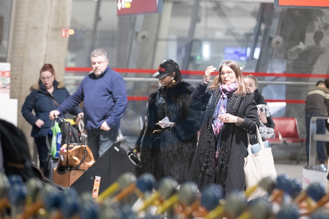 Winnie Harlow w czarnym futrze, maluje sie na lotnisku