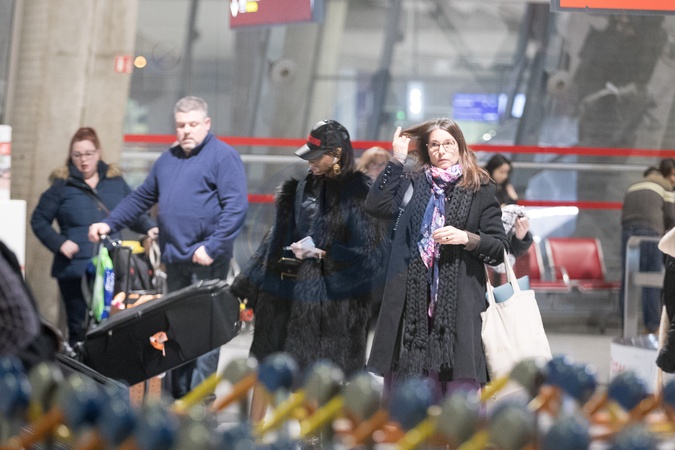 Winnie Harlow w czarnym futrze, maluje sie na lotnisku