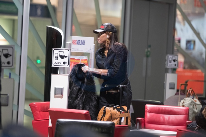 Winnie Harlow w czarnym futrze, maluje sie na lotnisku