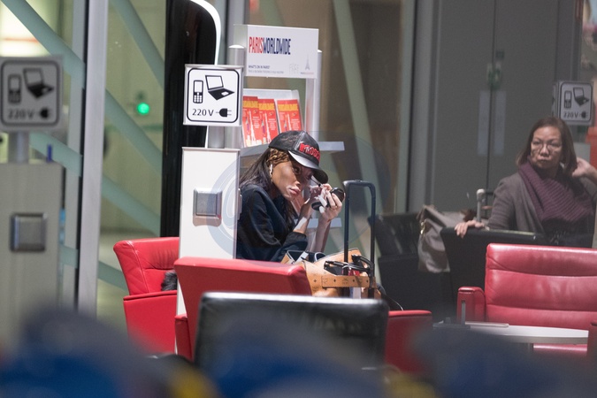 Winnie Harlow w czarnym futrze, maluje sie na lotnisku