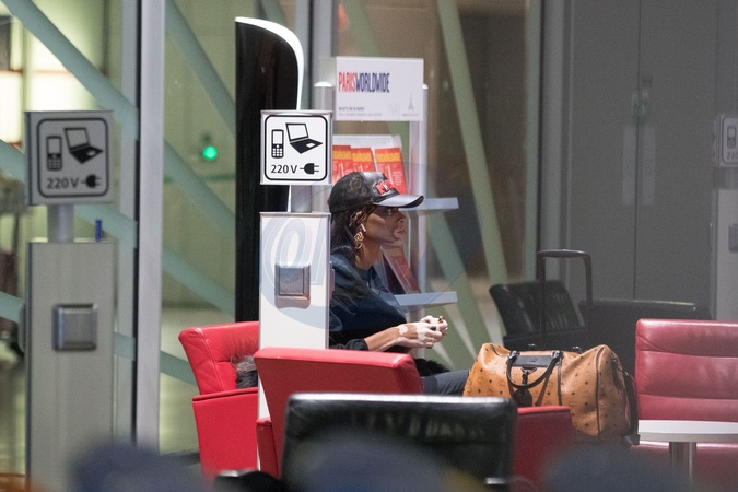 Winnie Harlow w czarnym futrze, maluje sie na lotnisku