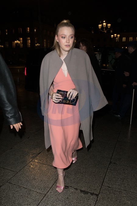 Dakota Fanning w rozowej, pudrowej sukience i szarym plaszczu wraca z pokazu mody