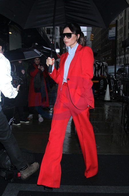 Victoria Beckham w czerwonym garniturze i z ogromnym parasolem