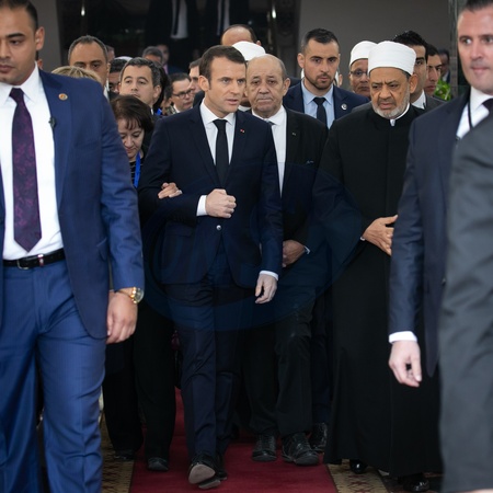 Emmanuel Macron, Jean-Yves Le Drian, Ahmed Al-Tayeb 01.jpg