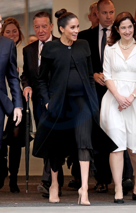 Ksiezna Meghan w czerni podczas wizyty w Association of Commonwealth Universities
