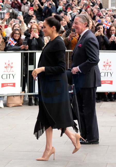 Ksiezna Meghan w czerni podczas wizyty w Association of Commonwealth Universities