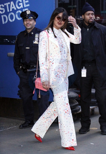Priyanka Chopra w bialym garniturze w kwiatki i z rozowa torebka Coco Chanel