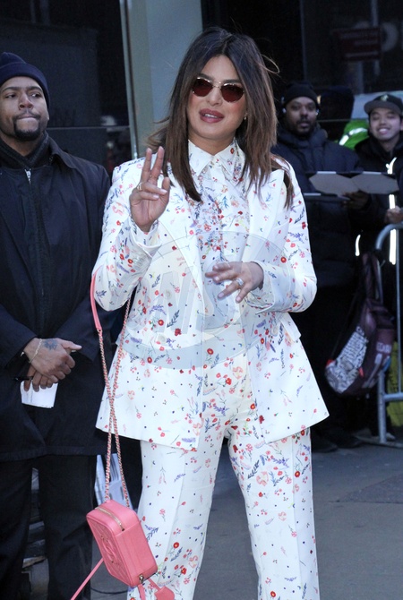 Priyanka Chopra w bialym garniturze w kwiatki i z rozowa torebka Coco Chanel