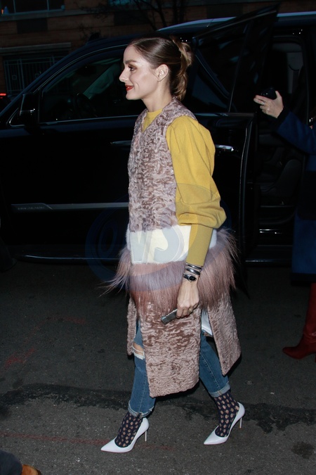 Olivia Palermo w dlugiej, futrzanej kamizelce w drodze na pokaz mody